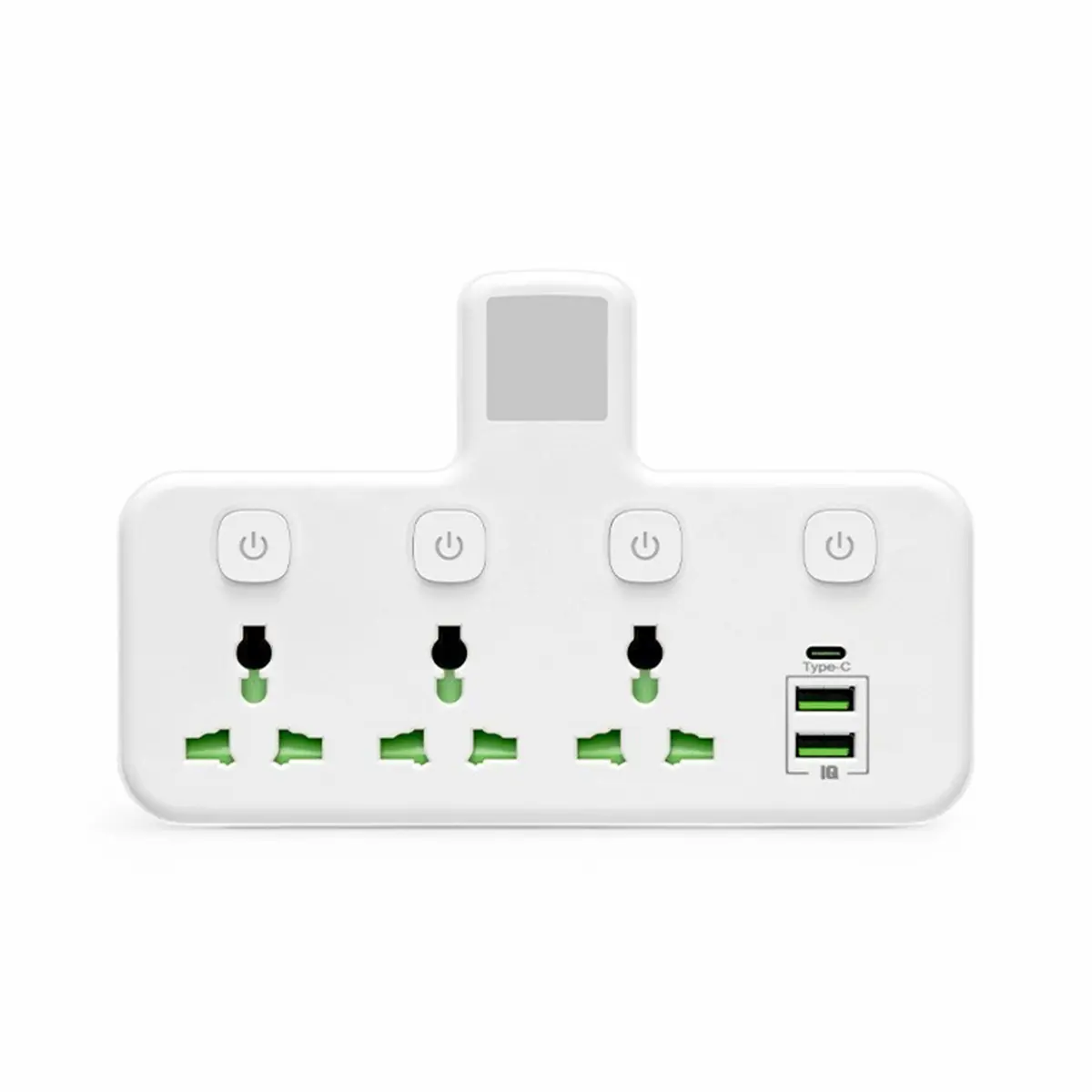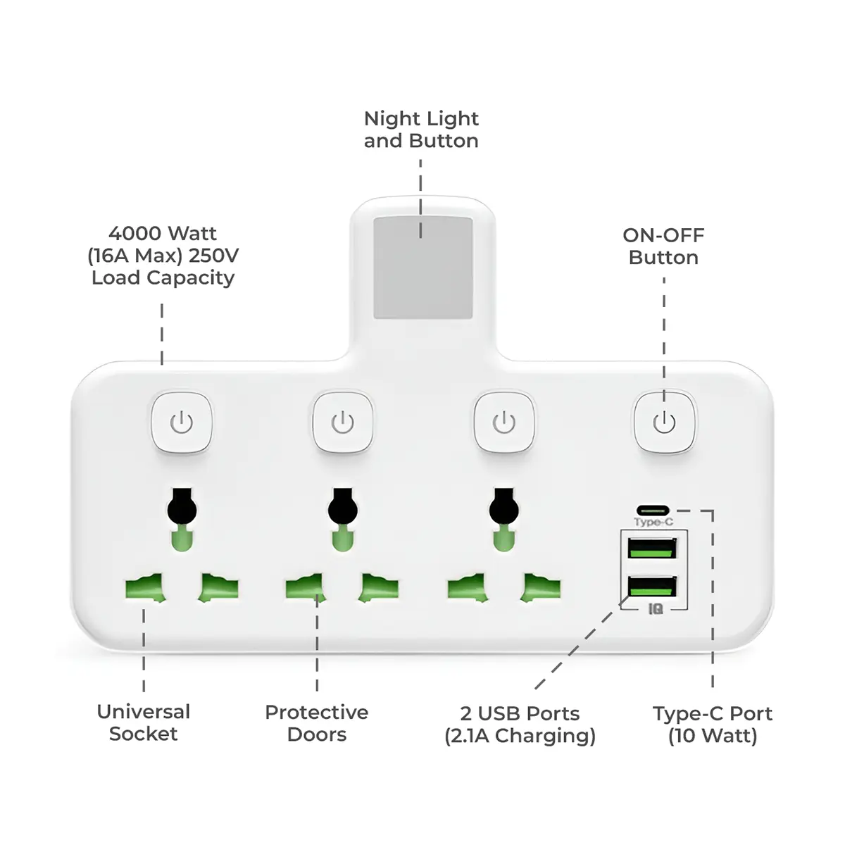 Comes with 3 universal sockets, each having safety doors to block dust and prevent accidental shocks.